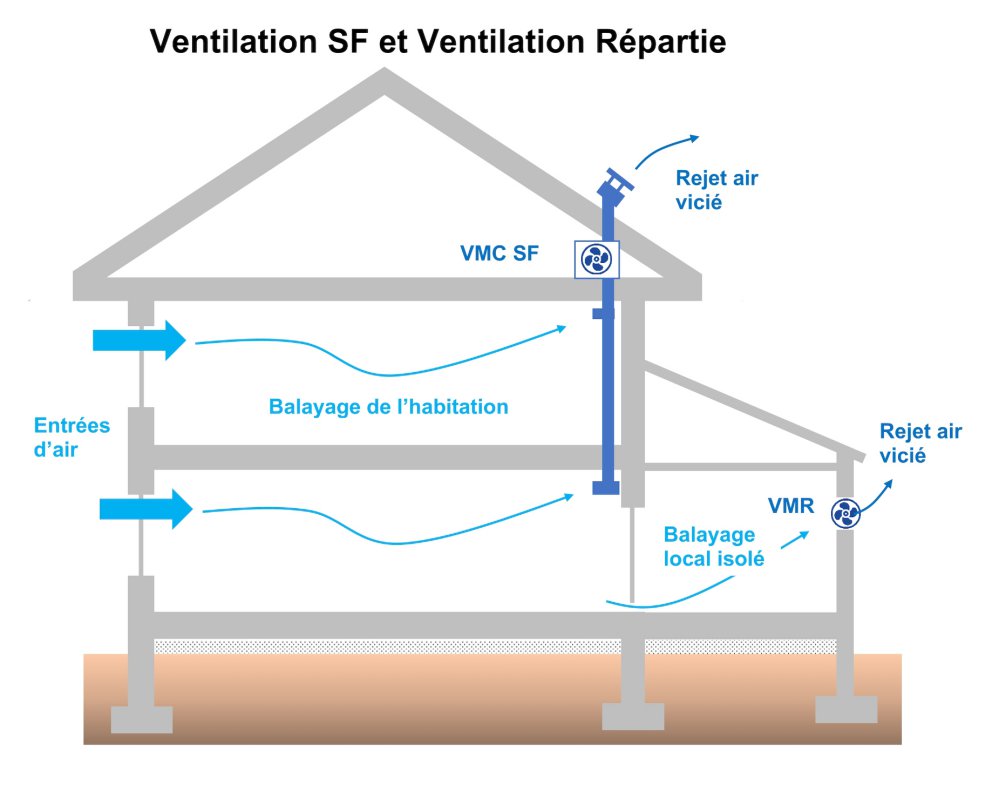 Dans le cas où la configuration de l'habitation ne permet pas la mise en oeuvre d'une VMC SF, il est possible de recourir à un système de ventilation mécanique répartie (VMR). Celui-ci consiste à installer des extracteurs d'air individuels dans les pièces à pollution spécifique (cuisine, salle de bains et WC). Dans certains on peut également combiner les deux systèmes (extension d'un bâtiment existant par exemple).