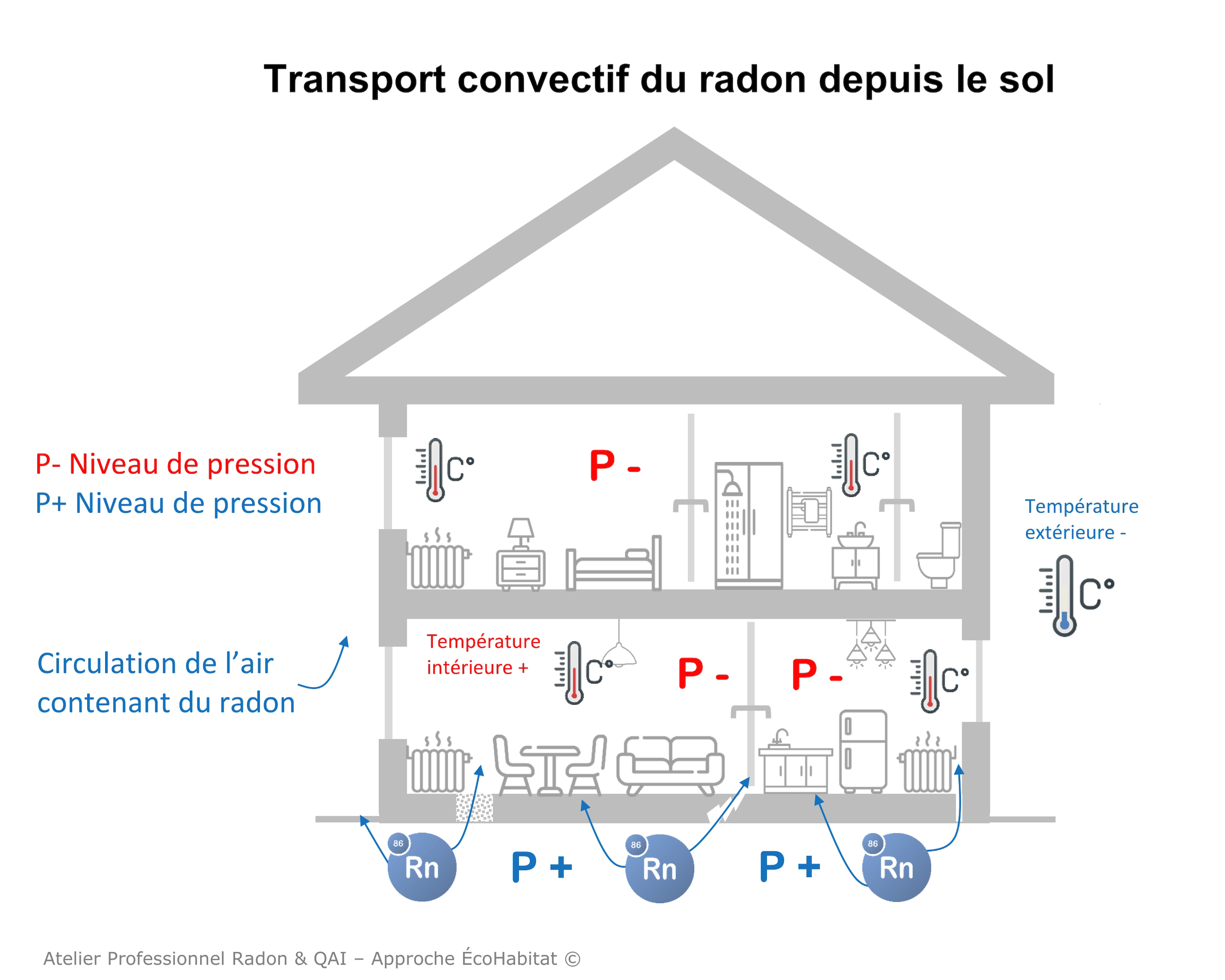 Ce phénomène appelé « transport convectif » est le moteur principal qui favorise l’entrée de radon. Il est à noter que les conditions météorologiques (vent, pression atmosphérique) et certains équipements (ventilation mécanique par extraction, appareil à combustion non raccordés, hotte à extraction,...) favorisent la mise en dépression du bâtiment et donc l’entrée de radon.