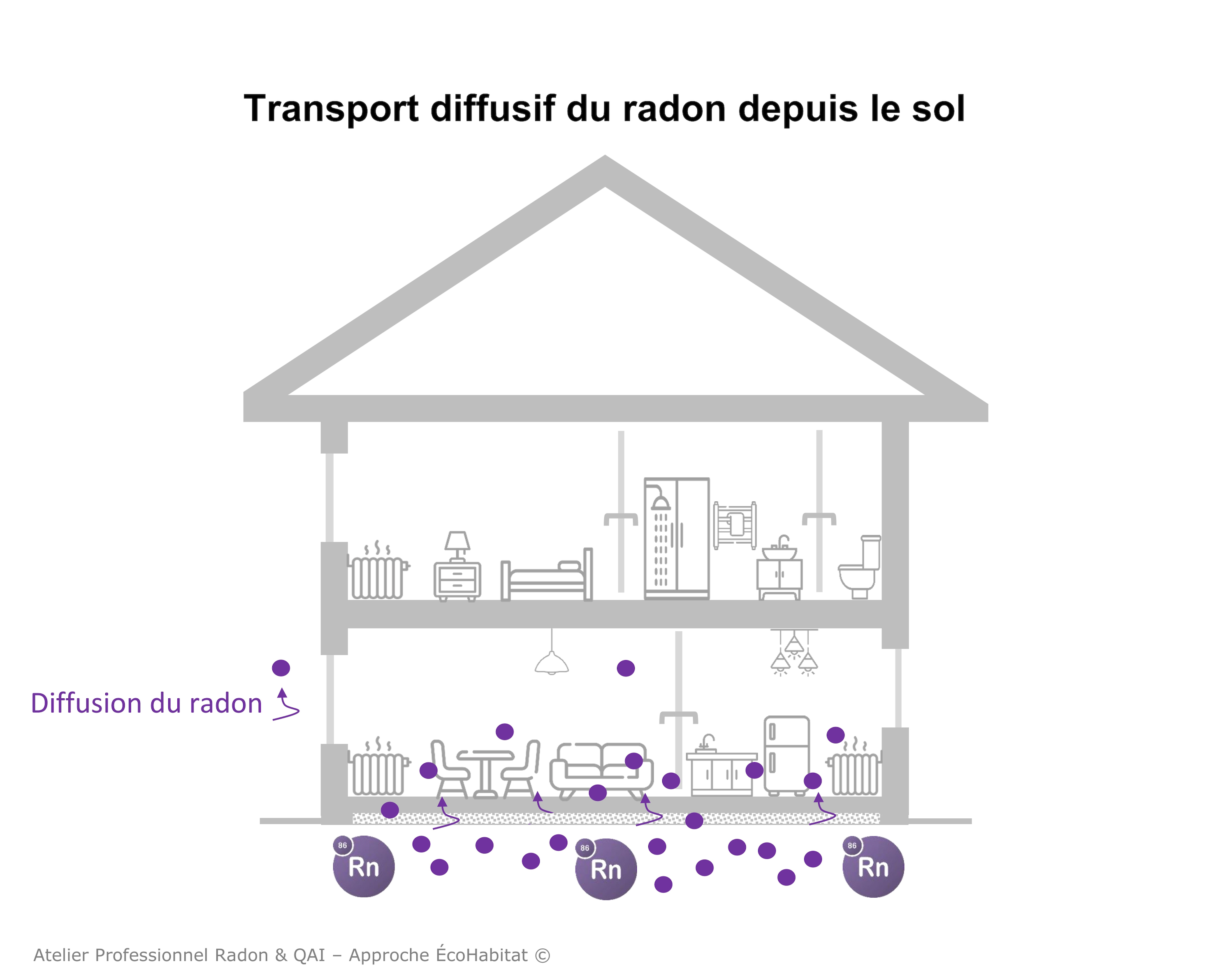 En effet, la concentration en radon dans l’air extérieur (sous le bâtiment) et intérieur (dans la partie habitée) tend à s’équilibrer. Ce phénomène appelé « transport diffusif » est secondaire, mais il est facilité lorsque les matériaux de construction sont poreux ou les sols très ouverts (cave en terre battue par exemple).